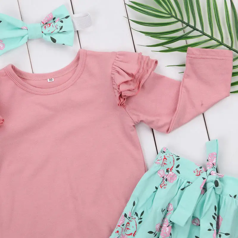 Infant Baby Clothing Sets Solid Long Sleeve Romper Floral Print Bow Pants Headband 3pcs Bebe Childr