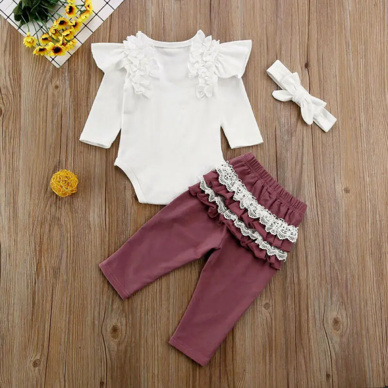 US Newborn Infant Baby Girl Ruffle Outfit Clothes Romper Tops+Pants+Headband Set