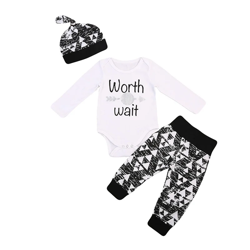 Infant Baby Kids Clothes Sets Worth Wait White Romper+Black Pattern Pants 3PCS Bebe Children Clothi